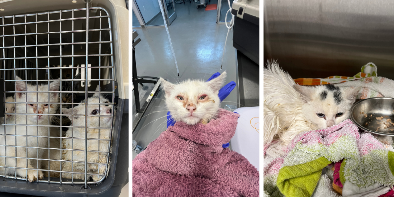 Kittens with eyes sealed shut from infection. Cats hunched and withdrawn, struggling to breathe through severe upper respiratory disease. Fur unkempt, bodies thin, trust nonexistent. These images tell the story of survival—but not yet of hope.